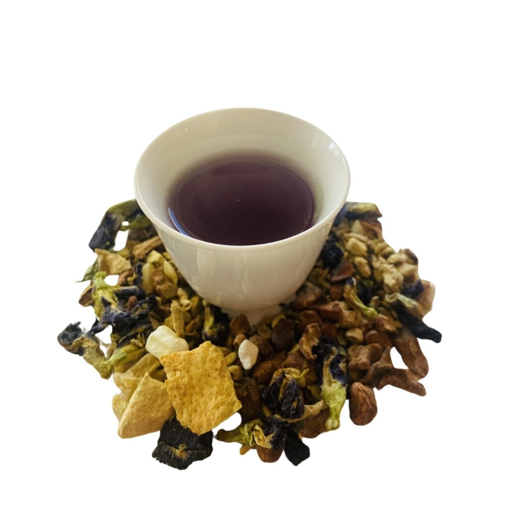 This blend is expansive. The ginger and lemon bring a familiar zing, one that always helps with throat soreness as well as digestion. Pineapple and apple deliver different styles of fruit sweetness. Basil perfumes the blend with anise flavors, and both blackberry leaf and moringa leaf contribute health advantages, as well as grassy, herbal notes. And then the butterfly pea flower turns the whole dream turn blue, as long as you add a drop or more of an acid, like lemon juice, to the brewed tea.