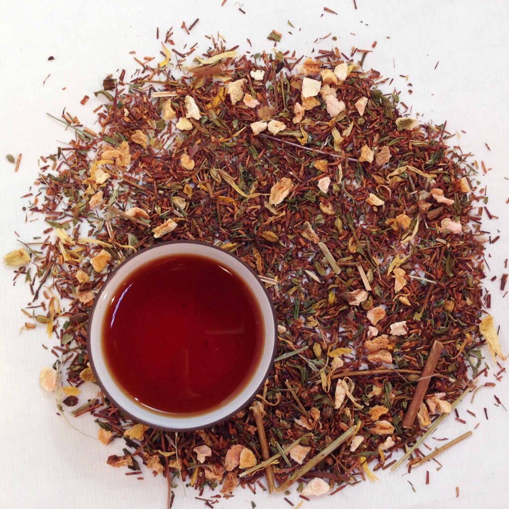 Our Be Happy Rooibos stands on firm ground—peach rooibos. Rooibos’s earthy notes pair beautifully with the deep peach notes. It also contains bright lemon peel. And then the spine of the happy bit (other than the wonderful flavor): St. John’s Wort. People in Europe have been taking the botanical for generations to lift their moods.