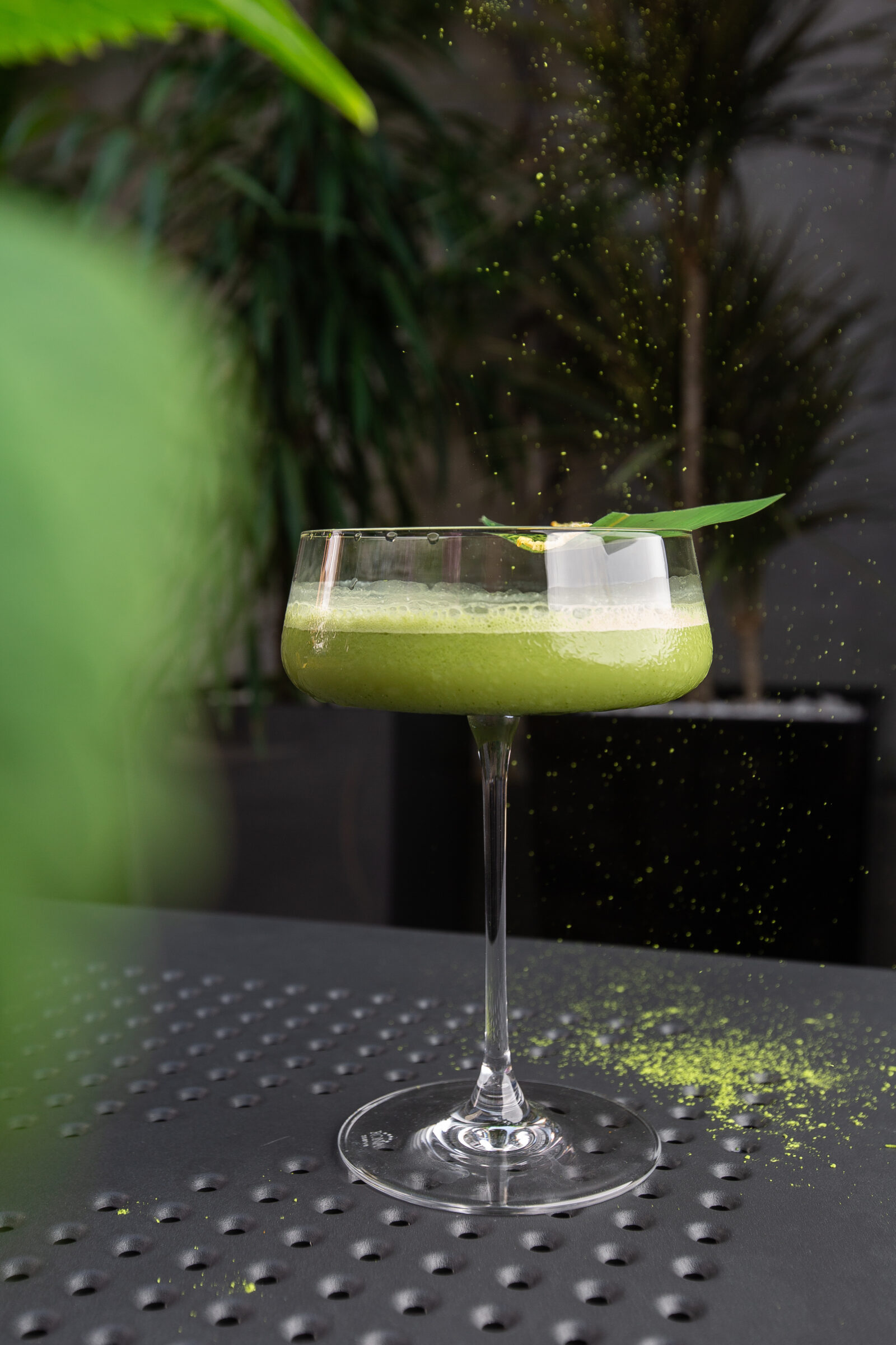 • Garnish with a thin lemon peel expressed over the glass or a very light dusting of matcha.