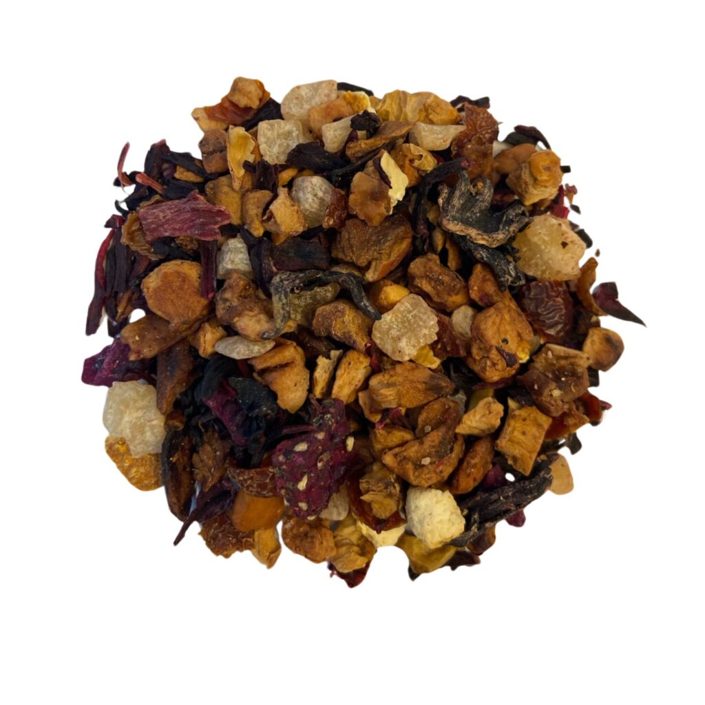 But this beauty’s benefits extend far beyond health. It also tastes fantastic. The rooibos itself broadcasts, warm, rich, earthy tones. Layered on top of that comes pomegranate, pomelo and orange—as well as carrot and safflower, for color.