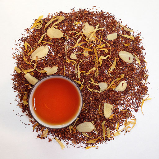This beauty rests on a foundation of rooibos—the same South African tea that bolsters the Pumpkin Pie blend above. Rooibos is earthy and delightful—healthy, too. To that we add calendula, which contributes a little woodiness and herbal qualities to the blend. It also brings soft color, hints of gold, to the final brew. Then comes two keys: real almond slivers and vanilla. As almond and vanilla dance in so many autumnal desserts, this blend serves as an ideal Thanksgiving dessert companion.