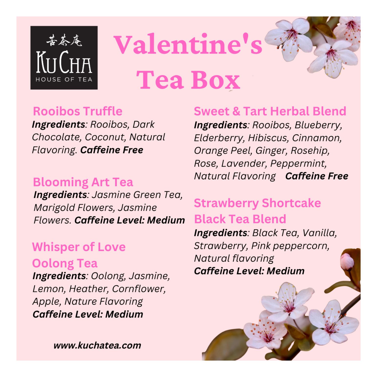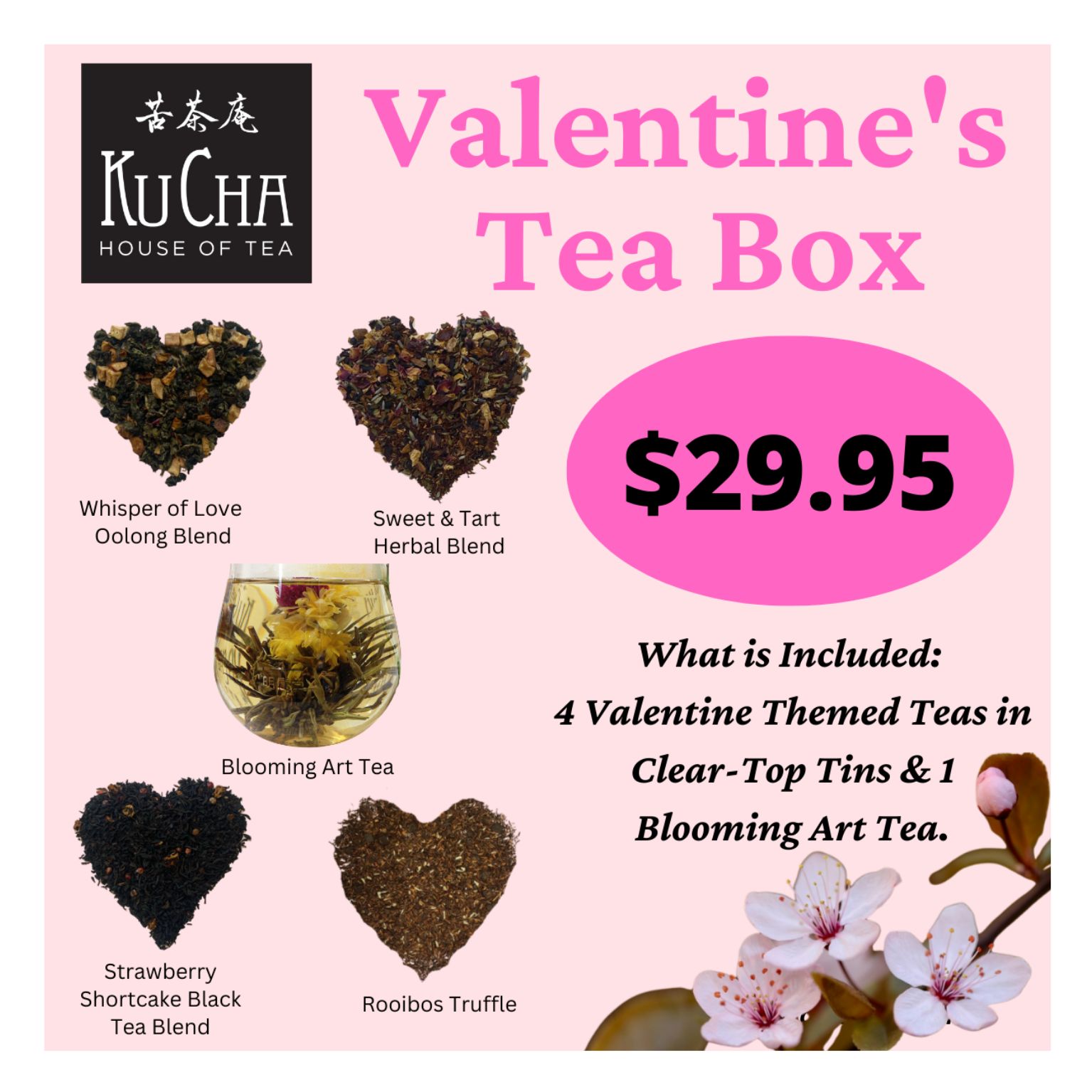 4 love-themed tea samples in cute clear-top tins and 1 blooming art tea. A perfect present to celebrate love's only holiday!